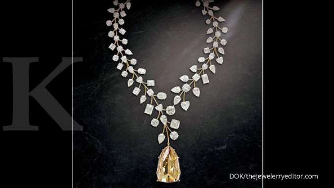 | Keistimewaan | : | Dibuat oleh Mouawad, pengrajin perhiasan Lebanon, kalung L’in Compatable Diamond Neckace ini menampilkan rantai emas mawar dengan bertatahkan berlian kuning seberat 407 karat dan 91 berlian putih dengan berat 200 karat. Berlian tersebut disusun asimetris menyerupai daun anggur. Berlian yang terletak di tengah dan luar biasa ini secara kebetulan ditemukan oleh seorang gadis muda di puing-puing penambangan di kota Mbuji Mayi di Republik Demokratik Kongo, Afrika pada 1980-an. Sedangkan intan kuning dengan potongan alami yang mewah ini dinilai oleh Gemological Institut of America sebagai intan terbesar dan tanpa cacat yang pernah diperiksa. Selebihnya, kalung ini terdiri dari 35 berlian bulat, 27 berlian berbentuk pir, sembilan berlian berbentuk hati, lima berlian potong zamrud, lima berlian bantal, empat berlian oval, tiga berlian yang dipotong Asscher dan dua berlian bercahaya. Dijuluki sebagai “yang tak tertandingi”, kalung ini beberapa kali disertakan dalam lelang, salah satunya di balai lelang Christie dengan harga US$ 12 juta, tapi tidak ada yang berani membelinya. |